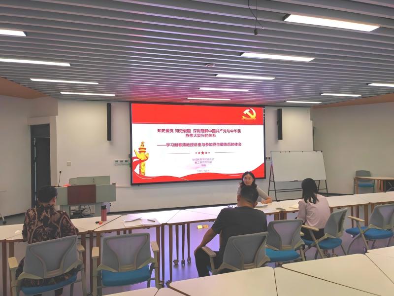 在学习活动中,在支部书记杨晓红的带领下,支部全体党员共同学习了谢春涛教授专题讲座,通过权威解读厘清党史发展脉络、领会精神内核,进一步筑牢信仰之基、补足精神食粮。随后,学院党总支书记马琼结合学校组织中层领导干部进行党性锻炼的实践经历,以“知史爱党,知史爱国,深刻理解中国共产党与中华民族伟大复兴的关系”为主题,与支部全体党员分享了学习感悟,将红色故事与教育使命、支部职责紧密结合,让理论学习更具实践深度。